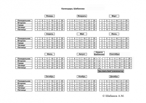 Здравствуйте Дмитрий Олегович Рогозин Вы, как заместитель Председателя Правительства Российской Федерации, координируете работу федеральных органов исполнительной власти, даете им поручения по ряду вопросов. В том числе: - выполнение государственной программы вооружения, государственного оборонного заказа и т.д.; - мобилизационная подготовка Российской Федерации и т.д.; - разработка и реализация государственной политики в сфере массовых коммуникаций и т.д.; - проведение планирования и контроль за исполнением и т.д.; - развитие системы мониторинга эффективности и результативности деятельности и т.д.; - государственная статистическая деятельность. Ваш круг вопросов довольно широк. При проведении ряда работ в промышленности, на пример в аэрокосмической, приходится использовать «метод сетевого планирования». «Сетевой график» был впервые применен в 50-е годы прошлого столетия при создание баллистической ракеты. Сетевой график оказался удобный для проведения «длительных» работ с привлечением большого числа участников. А сам сетевой график «привязан» к календарю. Мобилизационные «мероприятия», также надо «привязывать» к календарю. А необходимость проведения этих мероприятий может возникнуть в любое время и не всегда «допустимо» проводить, эти мероприятия, «предварительно». И в «горячее» время надо будет срочно все запланированные мероприятия «привязывать» к конкретным датам и выдать «безошибочные» приказы и т.д. Работа в области массовых средств коммуникаций так же «привязана» к календарю. Расписание «работы транспортных средств» всегда привязано к календарю. И все выше перечисленные «ряд вопросов», так же связаны с календарем. И все специалисты, которые проводят «привязку» выполнения «конкретных действий» к календарю сталкиваются постоянно, вот уже почти 500 лет, с одним «нюансом. В используемом в настоящее время Григорианском календаре продолжительность месяце не одинаковое и не все месяца начинаются в понедельник, не так просто быстро, в уме, точно вычислить интервал времени между двумя датами. Спросите сами на совещание своих специалистов, а хотели бы они работать по календарю, в котором продолжительность всех месяцев - одинаковое, и все месяцы начинаются в понедельник, а потому определение временного интервала между двумя датами весьма простое дело. Да и вообще календарь становиться одинаковым во все не високосные годы. Да и в високосные почти тоже. Лишь один день не «ряду». Я уверен, что они скажут, было бы хорошо, но это фантазия (сказка, мечта). Будут рады и те, кто занимается статистикой и анализом, «месячная гребенка» календаря их заставляет работать с дополнительно усредненными величинами. Лишние хлопоты. Но мы рождены, что б сказку сделать былью. Такой календарь есть, это календарь с рабочим названием «Календарь Шабанова». Описание календаря можно взять на сайте am436.ru , читать (скачать) – Статья - «Календарь Шабанов» Да мне удалось разработать его, в инициативном порядке. Государство не затратила ни одной копеечки. Пользуйтесь. Федеральное агентство по техническому регулированию и метрологии (Росстандарт) на счет моего календаря изложил свое мнение. Спасибо им за их работу, ну мнение они могут иметь и своё. Ссылки на документ https://www.dropbox.com/s/5xu7ulz7ogskj6i/Росстандарт ответ 2.pdf?dl=0 Так что к ним отправлять новый кал