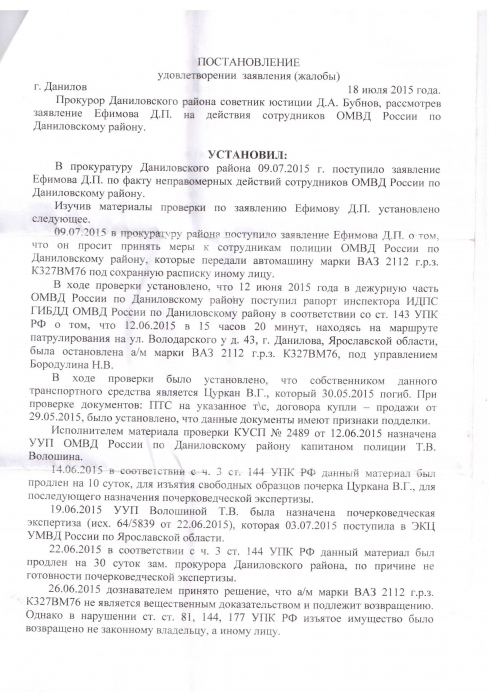 Мое авто поставили на стоянку РОВД до конца разбирательства я написал хадательство чтоб до конца разбирательства авто стояло на стоянке и не куда не кому не передавалось не смотря на все документы авто меньше чем через месяц пропало с охраняемой стоянки ровд оснащенной видеокамерами и ко всему этому ато было опечатано и была выдана расписка о том что следователь ставит его под свою ответственность авто пропало 4 июля 2015 года и по сей день его не кто не видел все документы на проверке в ровд делу хода не дают так как замешаны сотрудники ровд начальник и многие сотрудники.Мой полный адрес Ярославская область город Данилов переулок Володарского дом 6 квартира 2 телефон 89201149731 обращался в усб города ярославля обращался к трифонову николай ивановичу не каких результатов не дали мои действия.Владимир Александрович я решил обратится к вам думаю вы наведете в нашем РОВД порядок