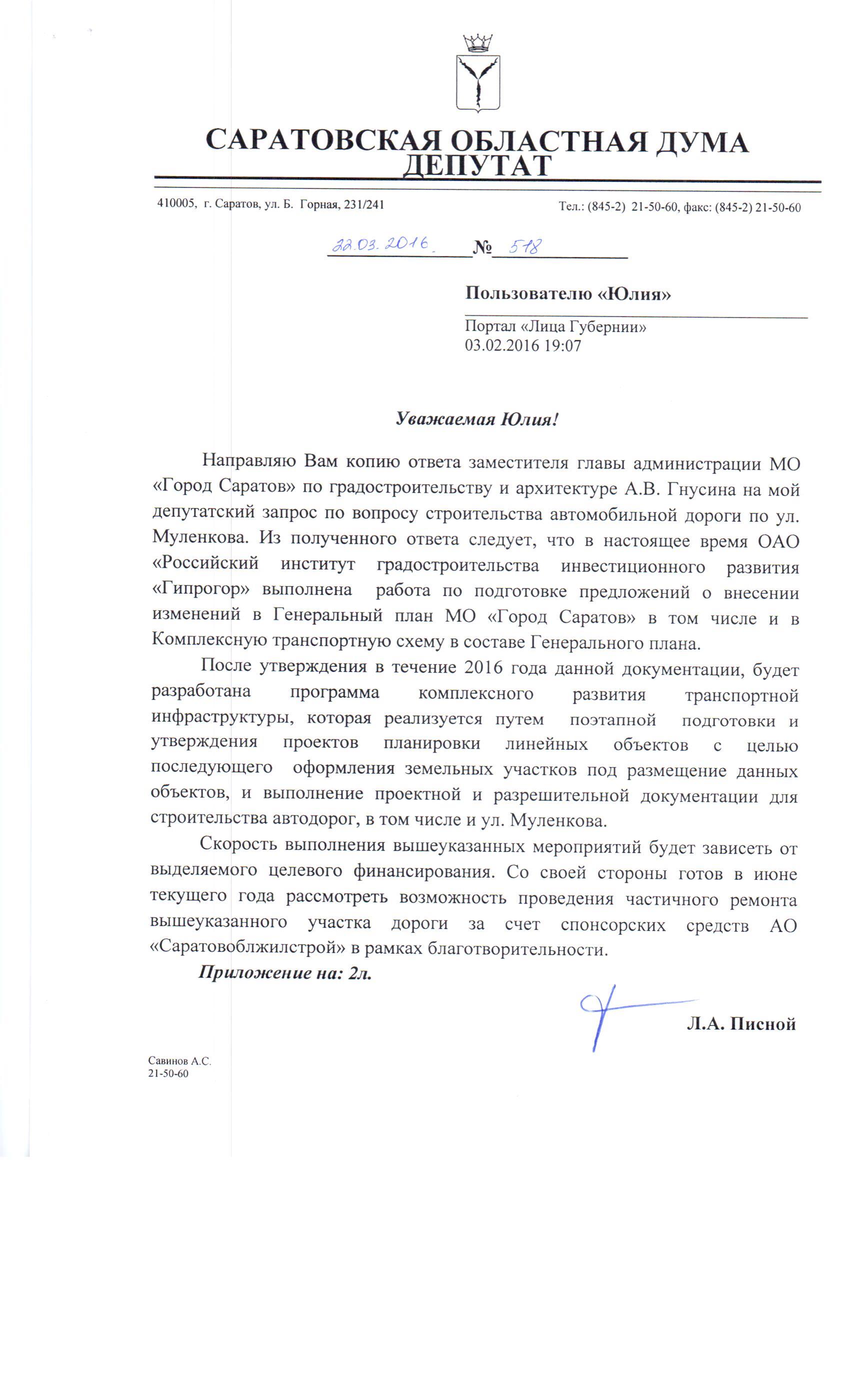 Уважаемая Юлия, пока, предварительно, Муленкова в план не внесена. И больше того, как такового плана нет. Я думаю, что Вы достаточно много читаете информации по ситуации с финансированием дорог Саратова, вроде бы она улучшается. И со слов и губернатора, и главы администрации будет выделение дополнительных средств. Поэтому я слежу за этим вопросом и думаю, что получится на практике хотя бы перекрыть асфальтобетоном. Во всяком случае, рассчитываю, что это должно произойти. Точнее скажу в конце марта. Что касается подтопления — думаю, что опять же, но уже своими силами, то есть силами «Саратовоблжилстроя», мы сможем решить эту проблему. И когда будет сходить снег, обязательно ещё раз свяжитесь с нами, чтобы мы посмотрели, где сделать водоотвод, чтобы он не топил ваш дом.