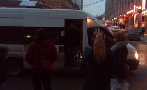 На фото видно, что маршрутка явно превысила лимит допустимых пассажиров. Это нередкая ситуация для 73-го маршрута. Ранее на этом маршруте были, помимо маршруток, автобусы большой вместимости, до 2013 года ходил трамвай маршрута 11. В настоящее время кроме маршруток иного транспорта в Ленинский район с улицы Радищева (СГСЭУ) нет. Можно солиться на то, что по московской ходит 11 автобус, но до него нужно идти в гору, примерно 1 километр пешего пути от эконома, а возможно кому-то и еще больше. Для пожилого человека этот путь не под силу, а в зимнее время есть вероятность упасть. Фото наглядно показывает, в какой неудобной транспортной ситуации оказалась центральная часть города после закрытия трамвая. Решить проблему можно, переводим маршрута 8 или 73 на автобусы. Фотографии были сделаны 29.02.2016 года в 17-35 по московскому времени.