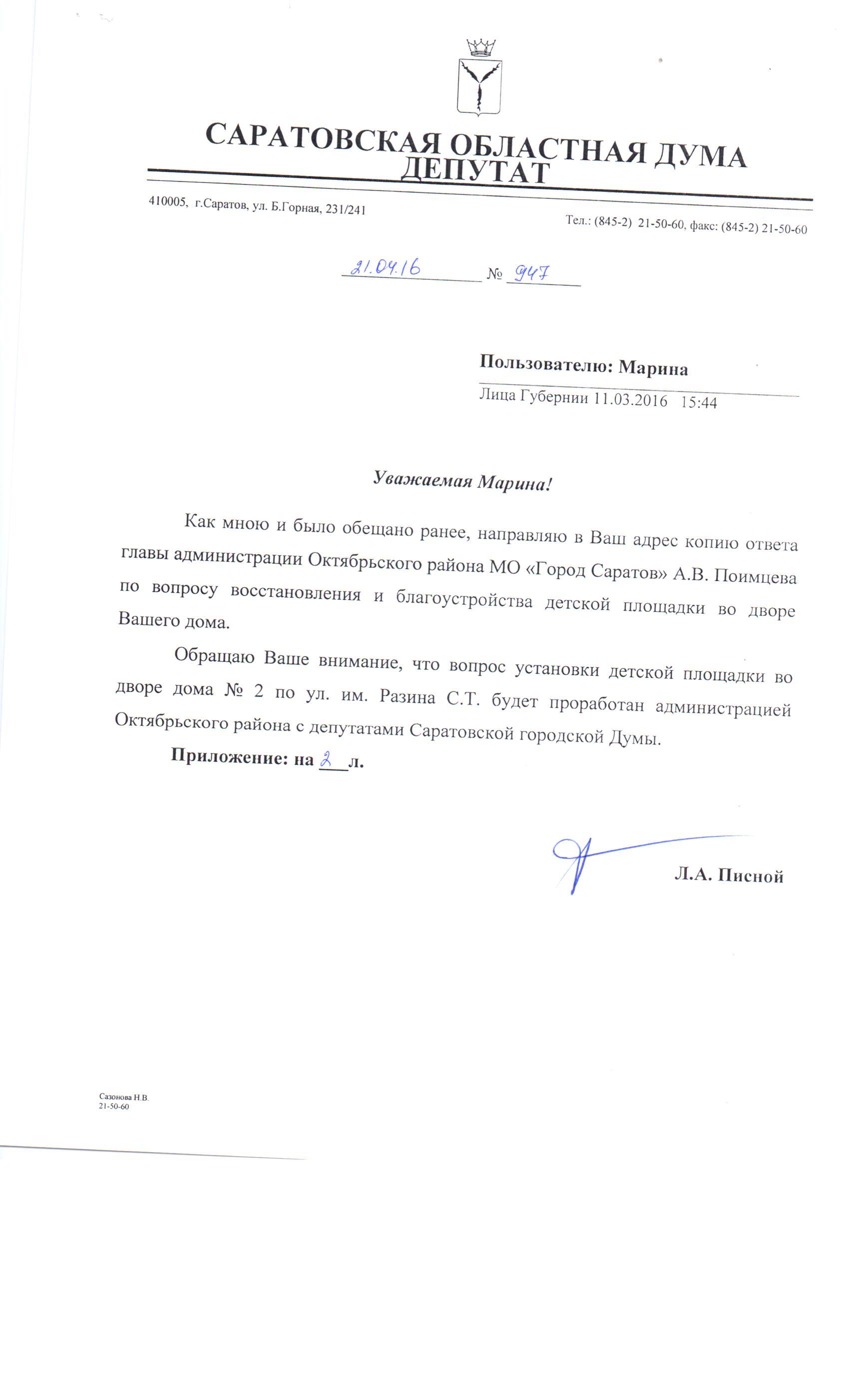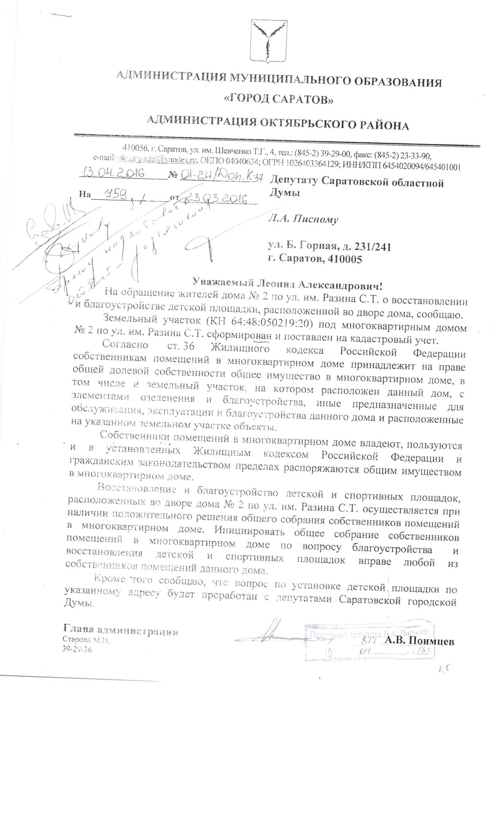 Уважаемый Леонид Александрович! Обращаюсь к Вам от лица собственников дома по улице Степана Разина, дом 2. Во дворе нашего многоквартирного дома (126 квартир) имеется небольшая детская площадка, которая была установлена в 1983 году - качели, горка, карусели. Металлические конструкции мы общими усилиями жильцов и УК «Коммунальник» поддерживаем в нормальном состоянии. Хочется отметить, что эта детская площадка не только нашего дома, но и соседнего (Беговая д.2) и данных игровых форм не достаточно для большого кол-ва детей разного возраста. Хотелось бы иметь во дворе игровые деревянные конструкции, лазалки, турники. Кроме того, во дворе есть заброшенная, полу разобранная спортивная площадка 1983 года постройки. Играть там, в спортивные игры совершенно не возможно, дети школьного возраста уходят в другие дворы. Т.к. спортивной площадкой не пользуются дети, в 2015 году на общем собрании жильцов ставился вопрос о сносе спортивной площадки и организации на этом месте стоянки для автомобилей. Силами родителей и пенсионеров, которые еще помнят время, когда площадка функционировала, удалось отстоять место для спорта. Детей и подростков нужно приобщать к систематическим занятиям физической культурой и спортом, формировать навыки здорового образа жизни. Мы обращались в УК с просьбой о реконструкции детской и спортивной площадки, нам было отказано в связи с нехваткой денежных средств. Наши дети очень нуждаются в обустроенном месте для игр и прогулок. Обеспечение спортивного досуга детей и подростков приведет к воспитанию здорового и социально активного подрастающего поколения. Просим не отказать в нашей просьбе и помочь с ремонтом и благоустройством спортивной и детской площадок. Очень надеемся на Вашу помощь.