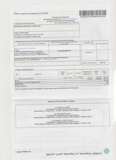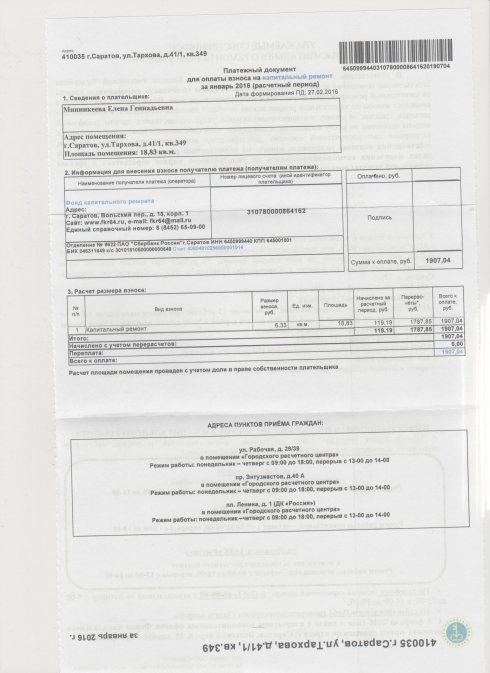 Добрый день, очень хочется получить ответ на вопрос "Сколько мы должны платить за капитальный ремонт?" В марте наш дом по адресу: г. Саратов, Тархова 41/1 первый раз получил платежные документы для оплаты взноса на капитальный ремонт за январь м-ц. У нас 2- х комнатная квартира, 3 собственника (2 взрослых и 1 ребёнок), поэтому мы получили 3 документа в которых стоит сумма к оплате 1 907, 04 итого в общем сумма составляет 5 721,12. Откуда такие цифры? На каком основании мы должны платить ежемесячно такую сумму?