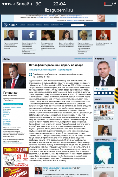 Уважаемый, Валерий Николаевич,подскажите, входит ли в планы ТСЖ Ленинского района ремонт дороги во дворе домов по адресу Проспект Строителей 70, 70А, 70Б? Дорог в Саратове частных нет, есть только муниципальные или федеральные. За дорогу отвечает администрация МО г.Саратов. В принципе, и ремонтировать то нечего, нужно просто положить дорогу заново. Расчетки за квартиру приходят каждый месяц, а ремонта дороги не было никогда. Грязь по колено - в прямом смысле этого слова!!! По колено! Клубы грязи! Полное бездорожье, асфальта не осталось совсем. Что бы пройти по нашей "дороге" - приходится одевать сменные резиновые сапоги или завязывать пакеты на ногах. Просто болото! Про бордюры, места парковки, детские площадки - вообще молчу! За что жители платят за квартиру? Что значит ответ ТСЖ Ленинского района о том, что сумма затрат на ремонт превышает сборы по оплате за жилые помещения? Куда их тратят то? На обслуживание наших домов - точно не тратят. У нас не сборы - у нас поборы! Я плачу за 34кв.м., 0 прописанных человек - 2750 руб по расчетке каждый месяц! А реальных услуг кот наплакал - радиаторы еле греют, и это с учетом, что они новые и полностью заменены за мои личные деньги! Все стены трещат по швам, потому что вечно затоплен подвал! Фундамент размыт! Максимум, что делают работники ТСЖ - это пилят деревья и раскидывают все ветки на дороге, потом они лежат еще неделю-две, перекрывая последние протоптанные дорожки. Когда планируется ремонт дорожного полотна?!!! Кто-нибудь обратит внимание на нашу проблему? Или все так и будут "закрывать глаза"? Сколько это будет продолжаться? Или решение возможно только через суд и обрещение в Москву? 89050311894 Анастасия
