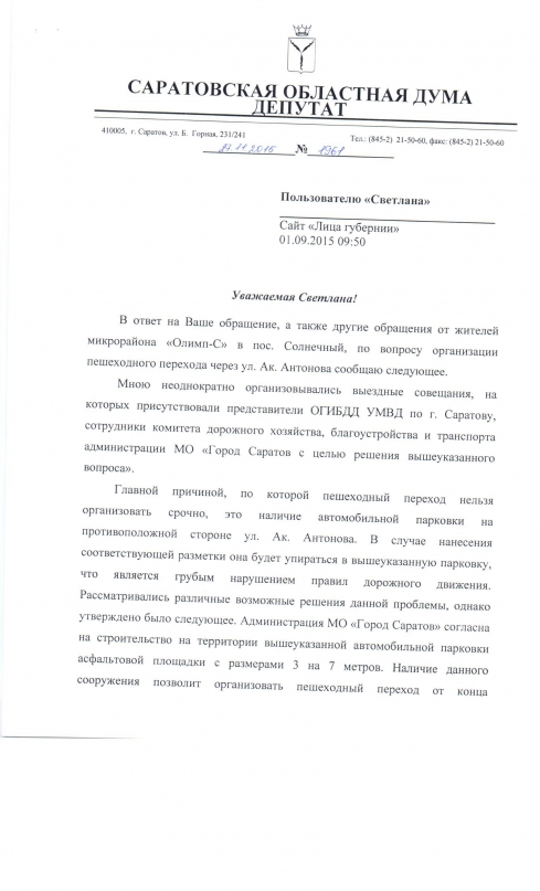 Здравствуйте! Хотела бы уточнить по поводу пешеходного перехода к дому комплекса Олимп-С, в сентябре 2015 года был дан ответ вашим помощником (фото писем прилагается). Было сказано, что дорожку и пешеходный переход будет сделан как только позволят погодные условия, на дворе скоро март, пока что переход не оборудован, жители так и бегают на свой страх и риск, когда доведут дело до конца, как было и обещано? Заранее спасибо!