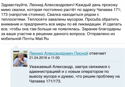 Здравствуйте, Леонид Александрович! Свалку на Чапаева 171, 173 убрали частично. Просьба посодействуйте, чтобы убрали весь мусор. Фотоотчет прилагается к этому письму (фото сделано 6.05.2016г.)