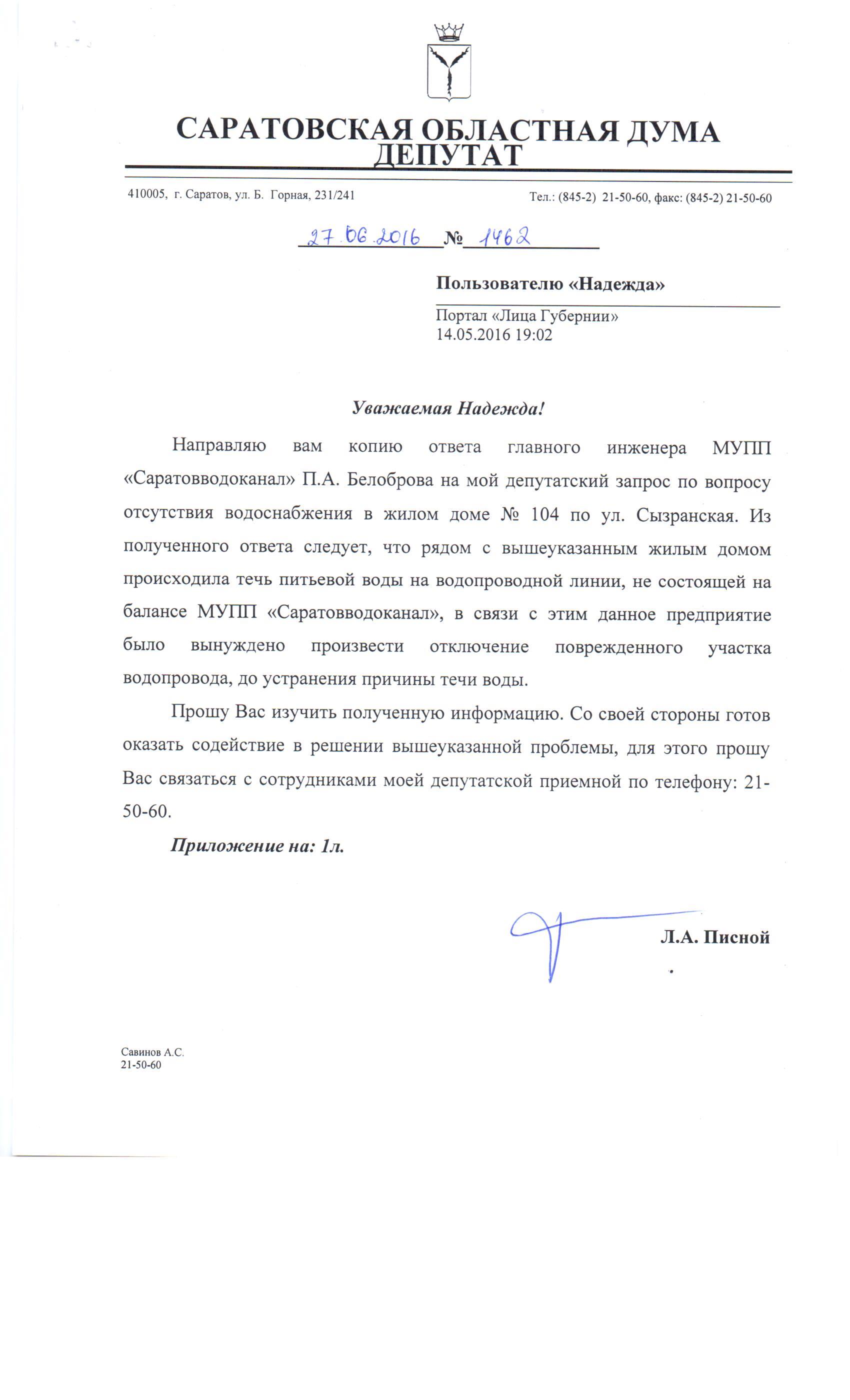 13.05.2016 по ул.сызранская 104 находится колодец к которому подключенны несколько домов, утром из этого колодца фонтаном била вода, вечером приехала ремонтная бригада и якобы устранила течь, на следующее утро в доме воды опять не было я подошла к колодцу и увидела, что мой ввод отсоедили от от общей трубы. Я позвонила в водоканал объяснила,на что мне ответили что частный сектор не обслуживают и я своими силами должна это исправить, а они якобы поставили заглушку, зачем мне не понятно. Это что вытягивание денег.осенью прошлого года та-же самая труба,которая уже давно сгнила в земле била фонтаном правда в другом месте целую неделю,я живу на противоположной стороне и вся вода идет ко мне когда водоканал начнет выполнять свои обязательства, а не только собирать платежи. Донастоящего времени воды в доме нет.У меня вопрос к кому должны обращаться жильцы частного сектора, Почему должны искать помощь где то, а плотёжки каждый месяц идут с водоканала.ПОЖАЛУЙСТО ПОМОГИТЕ