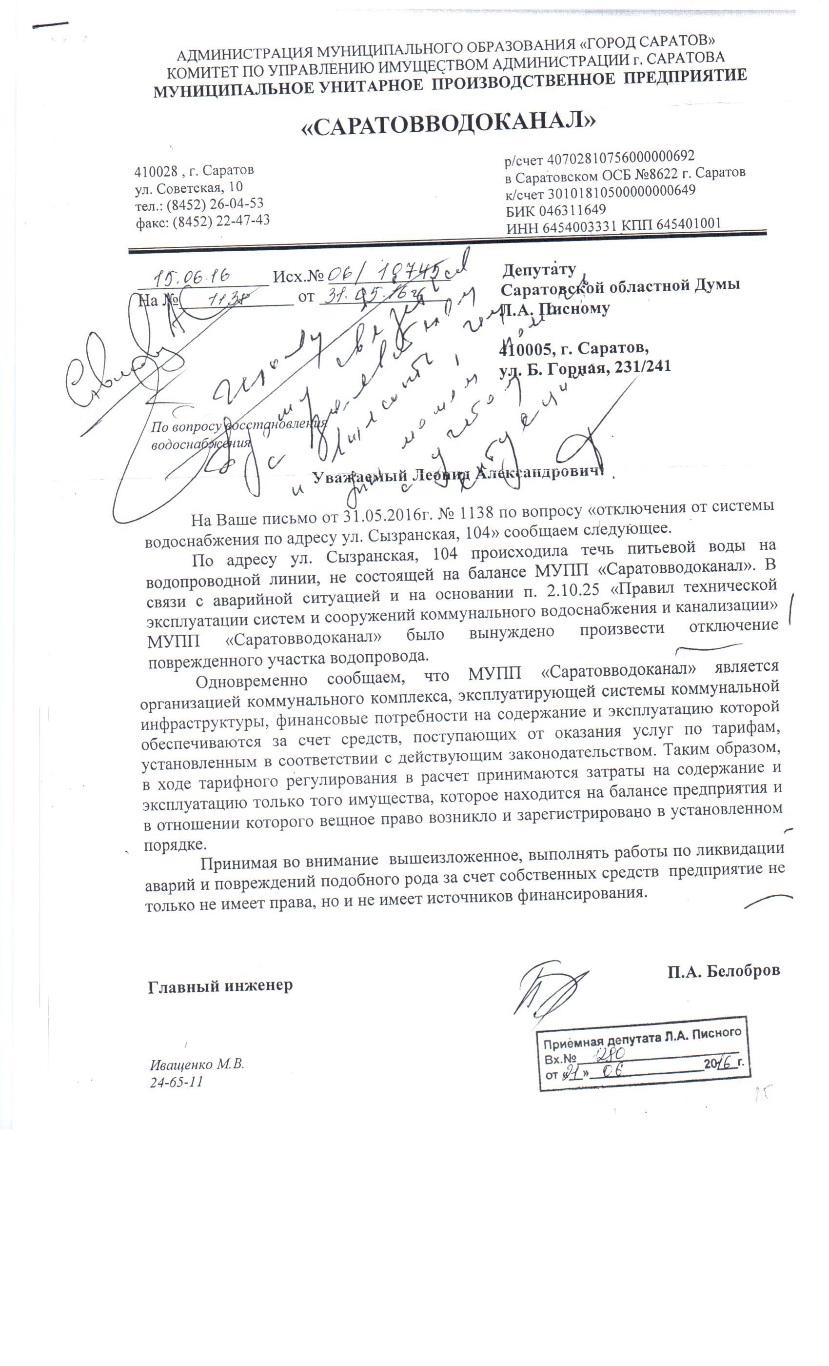 Уважаемая Надежда, если у Вас есть договорные отношения с МУПП «Саратовводоканал», их отказ является необоснованным. Потому что договор чётко предусматривает такое понятие, как «граница ответственности», и думаю, что она вряд ли находится в колодце, хотя всё может быть. Поэтому я подготовлю письмо в «Саратовводоканал», чтобы они как-то оказали содействие в разрешении вопроса. Вам советую ознакомиться с договором, а если у Вас его, не дай Бог, нет, то повторно обратиться к нам.