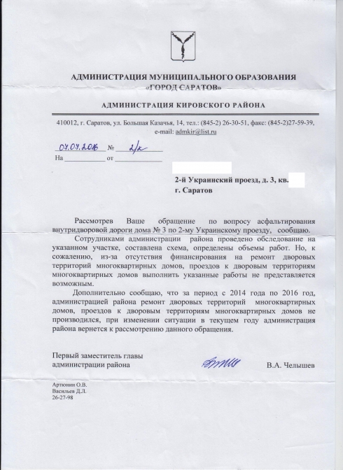 Здравствуйте, уважаемый Валерий Васильевич! Одна надежда только на Вас! У нас ужасное состояние дороги во дворе, асфальта местами вообще не осталось! Обращались в администрации города и района, на все у них один ответ - нет денег! Пожалуйста, выделите в таком случае финансирование на ремонт нашего двора из средств областного бюджета. Заранее благодарны, жильцы дома №3 по 2-му Украинскому проезду, г. Саратов.