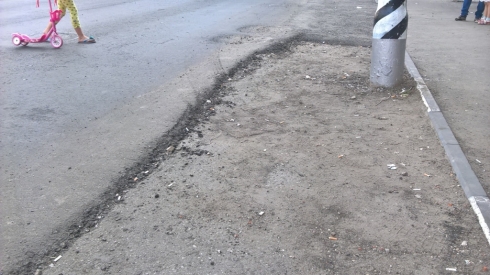 1. Первую сторону дороги в сторону Комсомольского починили, причем на кусочек асфальта возле остановки (резмер 2х1 м), видимо не хватило. Высота дорожного полотна на 10 см выше, народ спотыкается (см. фото) неужели на 2 квадратах асфальта можно много сэкономить. Аналогичная ситуация наблюдается на повороте в сторону домов. Неуж-то нельзя сделать переход плавным? Тогда и машины будут меньше разрушать новое покрытие...