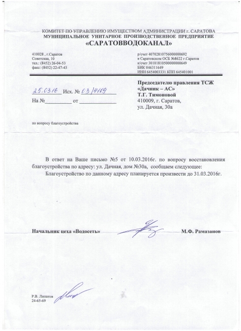 Я, председатель правления ТСЖ "Дачник-АС", обращаюсь к Вам с просьбой помочь нам в решении проблемы, которая не должна была быть проблемой, и тем более, как я полагаю, не должна решаться Вами. Но другого выхода я пока не вижу. 1 января 2016 года во дворе дома произошел прорыв трубы холодного водоснабжения, принадлежащей МУПП "Саратовводоканал". Авария была устранена, но канава до сих пор служит нам напоминанием о том злополучном праздничном дне. За это время она наполнилась мусором, на нем выросла трава. Эта яма находится на расстоянии 0,5 метра от стены дома. Балконы расположены в непосредственной близости от этого памятника искусства. Обращения в эту организацию результатов не дают.