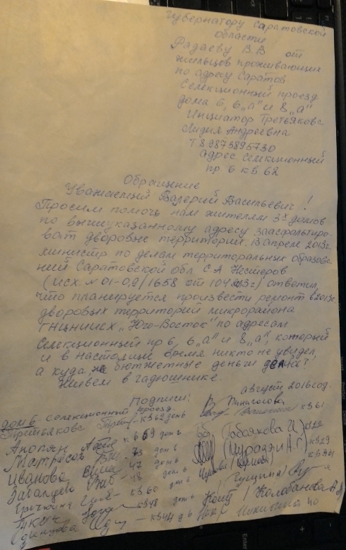 Уважаемый Валерий Васильевич! Хотели ли бы выразить слова благодарности в решении следующих вопросов по адресу: Селекционный проезд, 6. Проблемные деревья были спилены, устранена проблема с гидрантом питьевой воды, бурьян вокруг дома вырублен. Рады, что наши проблемы не остались без внимания. Но существует еще ряд проблем, в решении который требуется ваше содействие. Хотелось бы, чтобы привели в порядок дворовую территорию... Еще в 2013 году было сделано обращение по этому вопросу, и Нестеров С.А. ответил, что в 2013 году планируется провести ремонт дворовых территорий нашего микрорайона.. Но дело так ничем и не закончилось. Получается, слово дал, да не сдержал. Сейчас во всем городе ведется ремонт дорог. Это очень радует, и хочется, чтоб эта так называемая реставрация коснулась и нашего микрорайона, в частности, дома по Селекционному проезду, 6.. Прилагаю обращение жильцов дома. Есть еще один вопрос: жители соседнего общежития по адресу: Селекционный проезд,8 очень небрежно относятся к чистоте нашего района: постоянно рядом с ними образуются свалки мусора.. Его просто не доносят до мусорных баков, а бросают где попало.. Мы понимаем, что чисто не только там, где убирают, но и там, где не мусорят... Можно ли оказать какое то влияние со стороны властей, чтобы прекратить это безобразие?! Или посоветуйте нам, как можно решить эту проблему... Жители дома по адресу: Селекционный проезд, 6, кв.62 Конт.телефон: 8-987-389-57-30, 55-90-98 (Третьякова Лидия Андреевна)