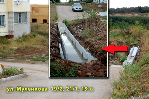 День добрый. Ваша строительная организация в августе этого года произвела установку системы отвода талых и ливневых вод от наших домов. за домом 19/2 внешне вроде все в порядке, за что, конечно же, спасибо. Но вот как рабочие сделали отвод воды от двора (смотреть на фото). Т.е. поставили 5 лотков, а после них идет земля, причем выше уровня этих лотков. На фото то, что осталось от небольшого ночного дождя. Боимся представить что будет когда начнутся дожди (фото отчет обязательно разместим тут). Это так и было задумано или просто доделывали уже для отвода глаз?