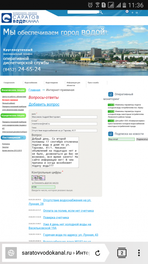 Никаких объявлений по прекращению подачи воды не было и нет по настоящее время! На сайте Саратовводоканал в разделе вопросы-ответы не возможно разместить вопрос, так как нет кнопки опубликовать, разместить, готово и т.д.! Т.е. форму заполнить можно, но опубликовать или отправить нельзя!