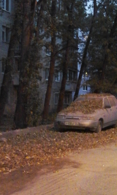 Проезжая часть на фото вся завалена листьями (Саперная,12). Обратите внимание на автомобиль (н/з р458от64) на фото. Стоит на одном месте не первый год.
