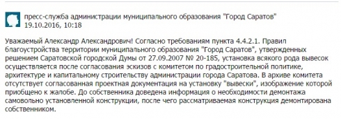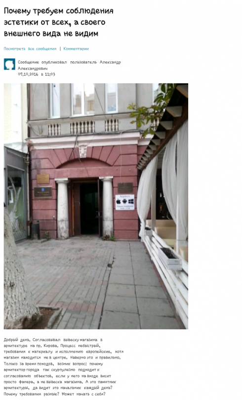 Уважаемый Валерий Николаевич! Написал вопрос 07.10, получил своевременный ответ. Вроде бы все хорошо, чиновники реагируют, работают... но по сути ничего не поменялось: на памятнике архитектуры по-прежнему висит несогласованная (исходя из Вашего ответа) вывеска-фанера, по-прежнему это каждый день видит главный архитектор и ничего не меняется. Почему?
