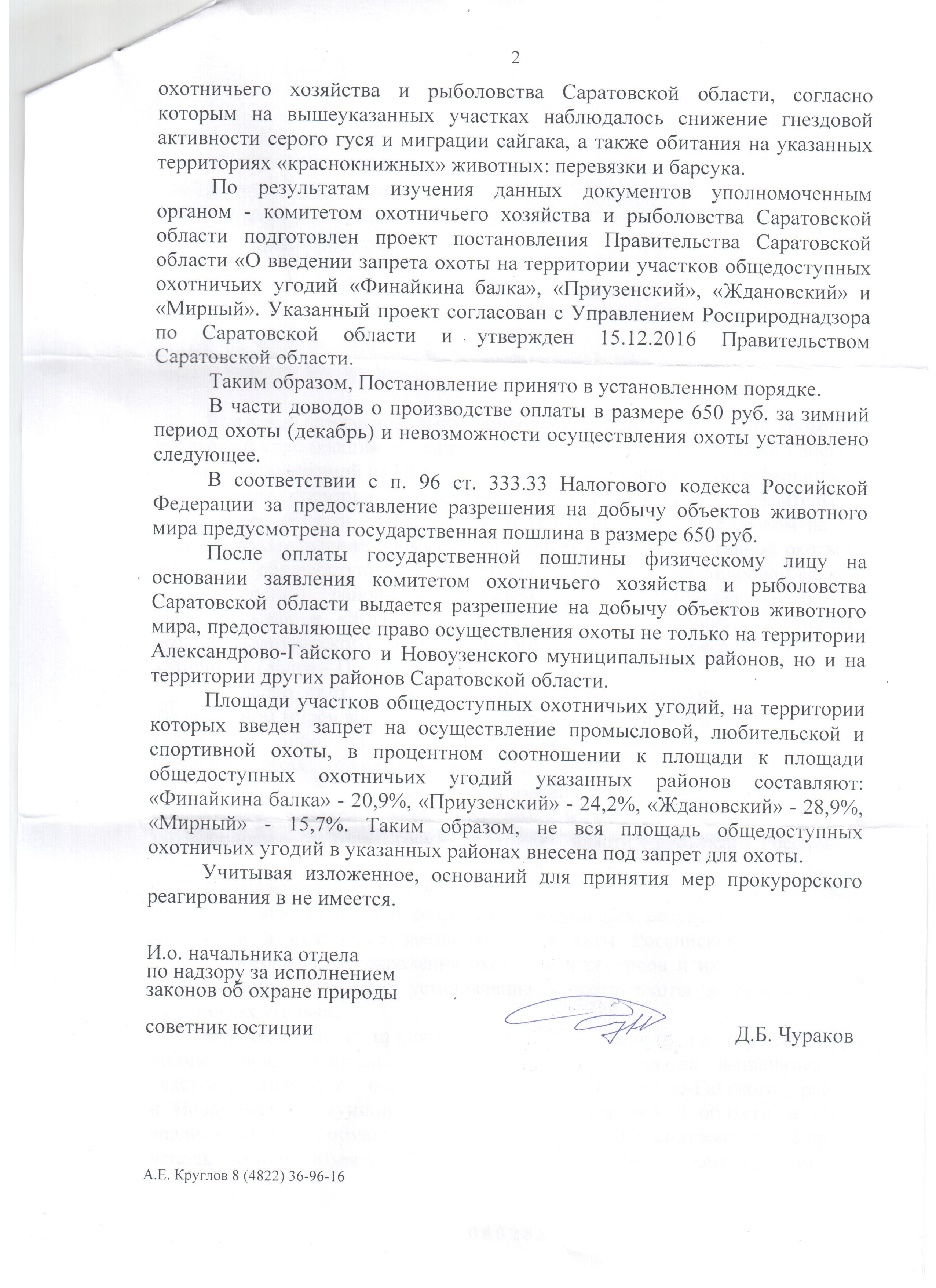 В период открытия охоты всеми любителями, зарегистрированными в комитете охотничего хозяйства и рыболовства Саратовской области, была произведена оплата в размере 650 рублей за зимний период охоты(декабрь), в этом же месяце поступает постановление о запрете охоты от 15 декабря2016 года №684-П г Саратов, за нарушение которого возлагается штраф.Так за что же мы заплатили? Если ввели этот запрет на конкретные зоны , а Александровогайский район находится в приграничной зоне , масштаб охоты резко уменьшился.
