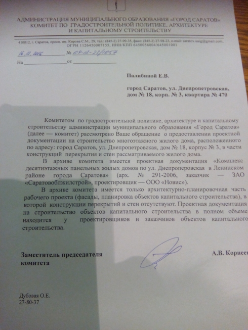 Добрый день, Леонид Александрович. Я проживаю по адресу: г.Саратов, ул.Днепропетровская, д.18, корп.3, кв.470 на последнем этаж. Этот дом построен АО «Саратовоблжилстрой». В настоящее время у меня в жилой комнате имеются протечки. Для того, чтобы установить причину протечек и осуществить грамотный ремонт мне необходима проектная документация в части конструкций перекрытия и стен. Я уже отослала официальный запрос на Ваше имя по почте. Запрос Вами получен. Со мной связывалась юрист от Вашей организации, но не смогла мне помочь. Очень прошу дать мне возможность ознакомиться и изготовить копию проектной документации на указанный многоквартирный дом.