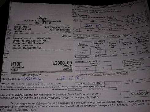 В настоящее время с учетом показаний газового счетчика 13 410 куб.м., переданных 28.02.2017г., сумма к оплате за газ по лицевому счету № 480097016891 составляет 4 936,66 руб.