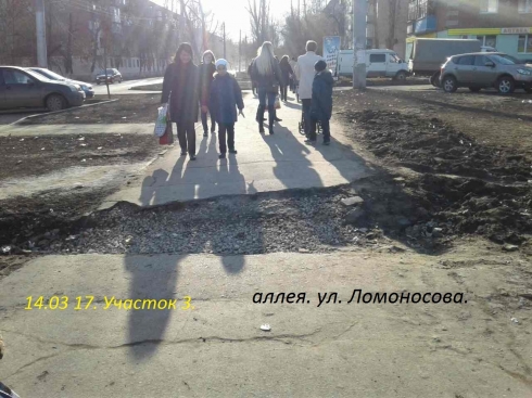Здравствуйте Леонид Александрович, Вынужден обратиться к Вам, с той же просьбой что и в том году. пишет вновь Покус Александр, инвалид-колясочник. Дело в том, что.. Зимой 2016 г. опять в том же месте была перекопана Аллея, опять прокладывали какой-то кабель. Пришла весна 2017 г. и вновь грунт осел и образовалась яма. Весь, парадокс в моей ситуации в том, что полгода всем было наплевать на эту яму. Эта яма была разрыта поперёк аллеи с ноября 2015 по август 2016 года. Все просто тупо, обходили и объезжали её с детскими колясками. Мне же приходилось.. объезжать по ухабам вдоль -дом БЫТА-либо на гл. дорогу выезжать. напомню, что в июне 2016 г. яма была засыпана щебнем, а в августе после того, как я написал Вам повторно проложили асфальт. А 12-декабря 2016 г. Вновь была раскопана аллея в том же месте. и я опять не уверен что её заасфальтируют без Вашего вмешательства. Прошу Вас, вновь разобраться с этой ситуации, и заасфальтировать участок 3. см. фото. ps. Если честно у меня в голове не укладывается, сколько можно перекапывать аллею и оставлять яму на долгие месяцы. адрес: г. Энгельс. ул. Ломоносова 17. сот. 8 917 203 93 11.