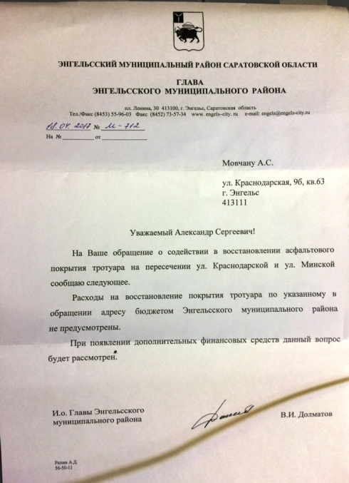Здравствуйте Валерий Васильевич. Прошу Вас помочь в решении вопроса о восстановлении чести тротуара по адресу: г. Энгельс, пересечение улиц Краснодарская и Минская. Дело в том, что я обратился к и.о. главы Энгельского муниципального района с этим вопросом и получил категорический отказ. Письмо с отказом во вложении. Уважаемый Валерий Васильевич, неужели наша область, а конкретно наш город настолько беден, что мы не можем восстановить 3 метра тротуара? Дело конечно копеечное но очень важное, по этой дороге молодые матери с близлежащих домов идут с колясками в детскую больницу. Поверьте мне на слово, я взрослый здоровый мужчина, но пройти по этой жиже и ямам полным воды с коляской было тяжело даже мне. Валерий Васильевич, огромная просьба, помогите пожалуйста с решением данного вопроса. Заранее спасибо.