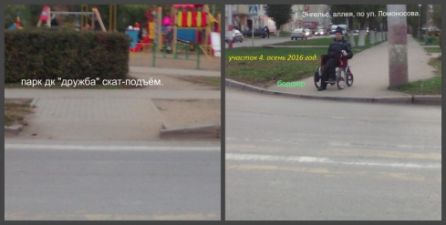 я Вам по моему не писал об этом нарушении всех норм при возведении объекта. Итак, в августе построили детскую площадку на территории ДК. дружба. скат-подъём, почему-то сделали только со стороны ДК. "дружба" съехав с которого попадаешь на перекрёсток и на "зебру" на гл. дороге. въехать же на аллею по прежнему не даст высокий бордюр. в сентябре они зачем-то накатали асфальт, может латали..