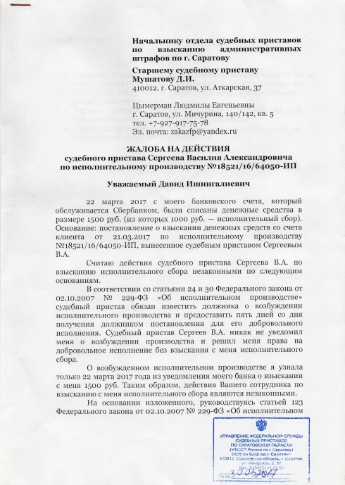 И.о. руководителя Управления Федеральной службы судебных приставов по Саратовской области, главному судебному приставу Саратовской области Решетняку И.Н. Цымерман Людмилы Евгеньевны г. Саратов, ул. Мичурина, 140/142, кв. 5 тел. 7-927-917-75-78 Эл. почта: zakazfp@yandex.ru Уважаемый Илья Николаевич! 30 марта 2017 года я обратилась в адрес начальника отдела судебных приставов по взысканию административных штрафов по г. Саратову Мушатову Д.И. с жалобой на действия судебного пристава Сергеева В.А. (копию прилагаю). В нарушении федерального законодательства (норм Федеральных законов: от 02.05.2006 № 59-ФЗ «О порядке рассмотрения обращений граждан Российской Федерации» и от 02.10.2007 № 229-ФЗ «Об исполнительном производстве») по истечении 2 месяцев моя жалоба не рассмотрена и ответ не направлен (в жалобе указывалось, что ответ должен быть направлен на электронный адрес). ПРОШУ ВАС: • привлечь к дисциплинарной ответственности виновных лиц; • проконтролировать рассмотрение моей жалобы и направить ответ на адрес (эл. почта: zakazfp@yandex.ru) Приложение: Копия жалобы с отметкой о получении от 30 марта 2017 (в 1 экз. на 2 л.). Цымерман Л.Е.