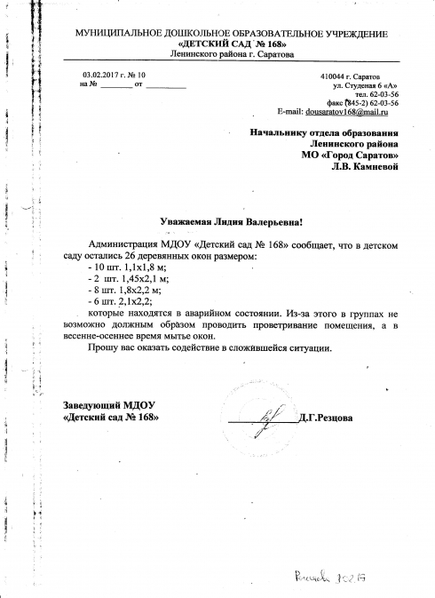 Заведующая МДОУ ДС №168 пыталась обратить на это внимание (письмо №9 и №10 от 03.02.2017г. (в приложении)), однако, на её письмо никакого ответа и никакой помощи не поступило. В связи с этим просим Вас о содействии в сложившейся ситуации, а именно просим помочь нашему ДС №168 произвести ремонтные работы по отделке стен, потолка и замене старых окон. Мы надеемся, что вы не оставите нашу просьбу в стороне и не обойдёте вниманием нашу проблему, так как находиться детям в группе в нынешнем состоянии мы считаем невозможным и это представляет угрозу жизни и здоровью наших детей. С уважением, коллектив родителей МДОУ ДС №168.