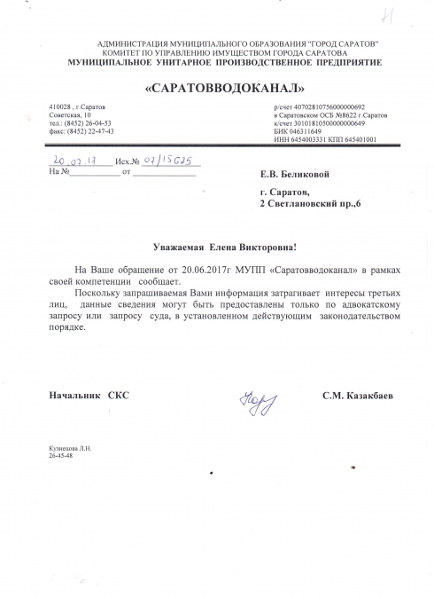 Возникает вопрос может пусть все врезаются в водопровод как хотят , ведь можно обойтись без документов.В 2004 году когда мы вели воду каждый из 6 домов заплатил за документы и работу по 60000 руб ,нас бесконечно проверяли и у нас всевозможные документы в порядке.Когда я обращаюсь в водоканал с просьбой пояснить на какой стадии оформления документы у этих женщин ,мне дают ответ который я приложила.
