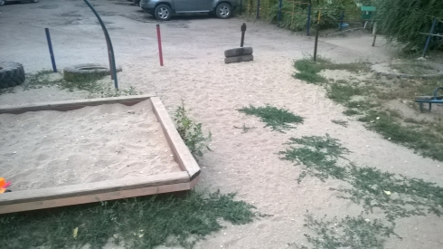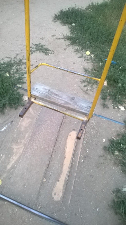 Ближайшая детская площадка находится на расстоянии приблизительно в 1км от нас; чтобы добраться до неё, с детьми нужно перейти или переехать с колясками проезжую часть. Качели, которые установлены в нашем дворе, уже поломаны, им более 30 лет, сидеть на площадке не где, не установлены скамейки, приходится сидеть на брёвнах. Турник установленный уже покосился, то и гляди упадёт кому нибудь из детей на голову. Так же на площадке лежат старые, резиновые колёса, для того чтобы на територию не проезжали машины. Хотели бы, чтоб установлена была горка для детей, чтоб было побольше развлечений.