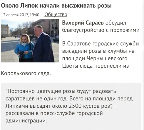 Добрый вечер. Скажите пожалуйста, во главе Волжского района Вами назначен самый большой специалист в сфере благоустройства нашего города. Почему 2500 кустов многолетних роз, высаженных весной этого года в центре нашего города, возможно на муниципальные средства, остались не подготовленными к зиме?
