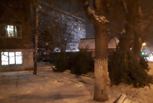 На фото видно, что незаконная торговля елями от ТД "Хрустальный" переместилась на 100 м выше по дороге. Управление по торговле этого "не знает"? Ели сложены на зеленой зоне и тротуаре, место не освещено, не огорожено, нет обозначений. Такое не может происходить под окнами участкового пункта полиции без согласия Ваших сотрудников по торговле? Как Вы считаете?