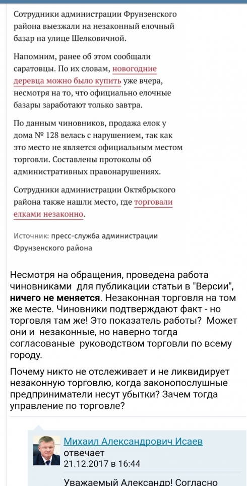 Уважаемый Александр! По сообщению администрации Фрунзенского района, размещение елочного базара по адресу: ул. Шелковичная, 128 осуществляется в соответствии со схемой размещения нестационарных торговых объектов на территории муниципального образования «Город Саратов» на 2016-2020 годы, утвержденной постановлением администрации муниципального образования «Город Саратов» от 15.04.2016 №954 (с изменениями от 03.11.2017 №3357).