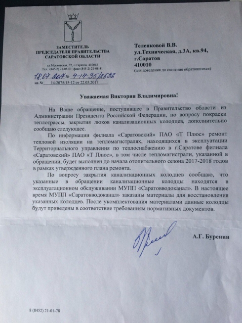 неужели город так обнищал, что водоканал не может закрыть 2 люка по ул. Крайняя (пересечение 3 и 4 нижнего проезда), об этом жители просят в течении года.не стыдно?прошу примите меры!!!Так же в ответах данных мне еще летом прошлого года сказанно что Т Плюс до начала отопительного сезона приведет в надлежащее состояние теплотрассу проходящую по улице Крайняя (требуется окраска опор и замена изоляции) но ничего не сделали,стекловата продолжает сыпаться нанаши головы и головы наших детей.мы с большим удовльствием встретилсь бы с вами на наших улицах,что бы вы оценили все красоты нашего рйона. Если вы захотите что-то из этого для нас сделать мой телефон 8987-808-80-08