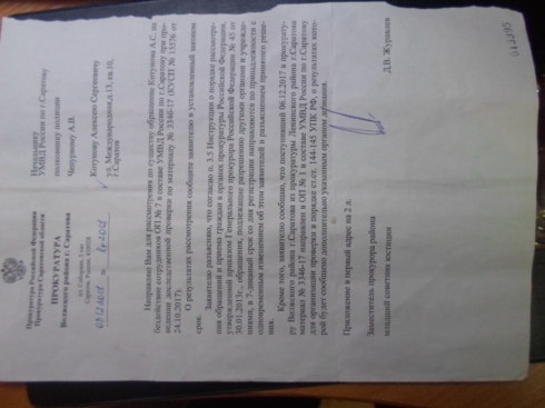 Благодарю вас за направленное обращение. Материал изучен и взят на контроль. В настоящее время по указанным вами фактам проводится проверка, по результатам которой будет принято решение в соответствии с действующим уголовно-процессуальным законодательством.