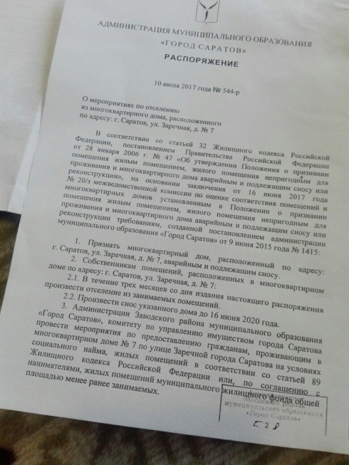 Добрый день уважаемый Александр Григорьевич,хочу обратится к вам с проблемой об расселении аварийного жилья.По адресу:г.Саратов,Заводского района,ул.Заречная, д. № 7 по этому адресу было полученно "Распоряжение" о том что этот дом признан аварийным еще от 16 июня 2017 года и уведомили о том , что нас жильцов этого дома должны расселить в течении трех месяцев после получения этого документа,прошел уже почти год но нас так и не расселяют.Александр Григорьвич прошу посмотреть фото одного из подьздов данного дома и убедится в том что в этом доме невозможно жить и у нас нет уверенности в том,что он не рухнет как нибудь ночью.Люди пенссионного возраста,семьи с маленькими детьми,молодые люди уже не знают куда обратится с этой проблемой и мы вас убедительно просим принять меры по данной проблеме и надеемся что нас уже расселят в скором врмени из этого "дома".И убедительнная просьба чтобы при расселении нас не отправили в другой конец города,это будет очень проблематично для всех жителей этого дома так как у некотрых(дети ходят в садики,школы,люди ходят на работу)Заранее выражаем вам огромную благодарность от всех жильцов этого дома!!!