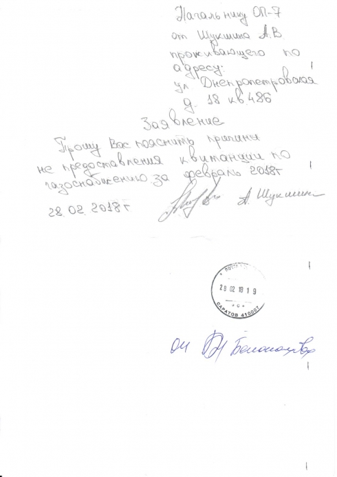 Я, Шукшин Андрей Владимирович, проживающий по адресу г. Саратов в. ул. Днепропетровская д. 18 кв. 486 обращался к Вам 27.09.2017 г по вопросу не предоставления сотрудниками почтового отделения №7 корреспонденции, в т. ч. квитанции на оплату услуг за газоснабжение в период май – август 2018 г.