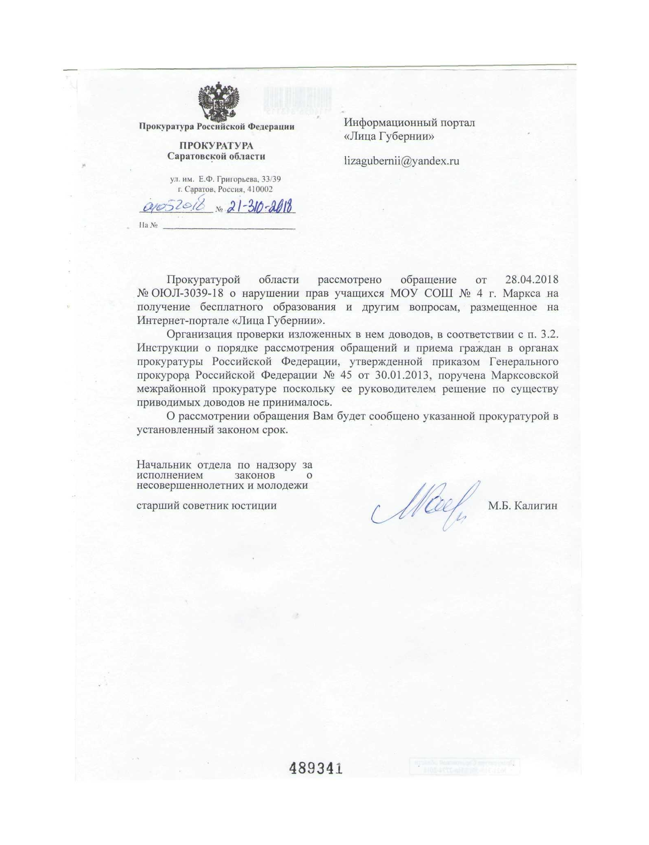 Просим Вас разобраться с ситуацией в школе №4 г.Маркса: