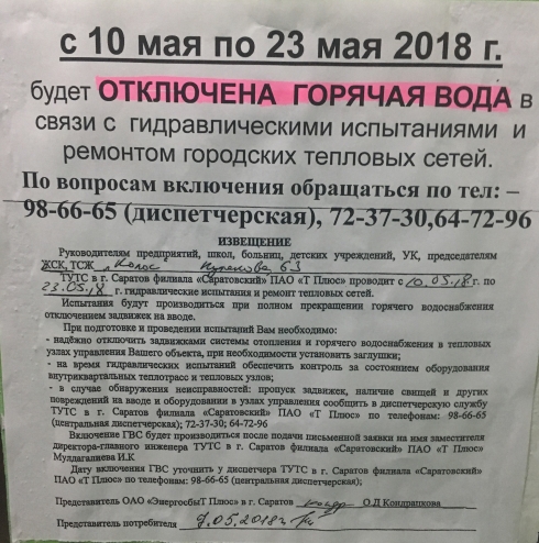 9 мая в нашем подъезде появилось извещение, что в связи с гидравлическими испытаниями будет отключено ГВС с 10 по 23 мая. Но! Я регулярно смотрю сайты Саратовского филиала «Т Плюс», Информационный портал по вопросам качества горячего водоснабжения и отопления в г. Саратов и новостные сайты. Нашего адреса не было нигде!!! Более того, на извещении нет печати! Филькина грамота, из которой мы, жильцы, делаем вывод, что на нас просто экономят!!! Фото прикладываю.