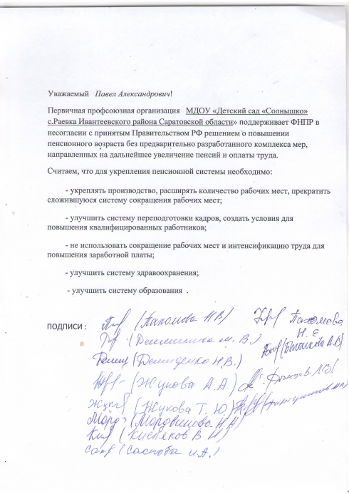 МДОУ "Детский сад "Солнышко" с.Раевка Ивантеевского района Саратовской области поддерживает ФНПР в несогласии с принятым Правительством РФ решением о повышении пенсионного возраста