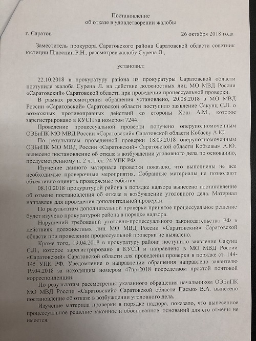 Даже постановление об отказе в возбуждении уголовного дела мне не выдают и не направляют по почте… Я узнал о том, что вынесено такое постановление от лица, в отношении которого просил провести проверку в ходе рассмотрения иска в Арбитражном суде Саратовской области по делу № А57-7052/2018.
