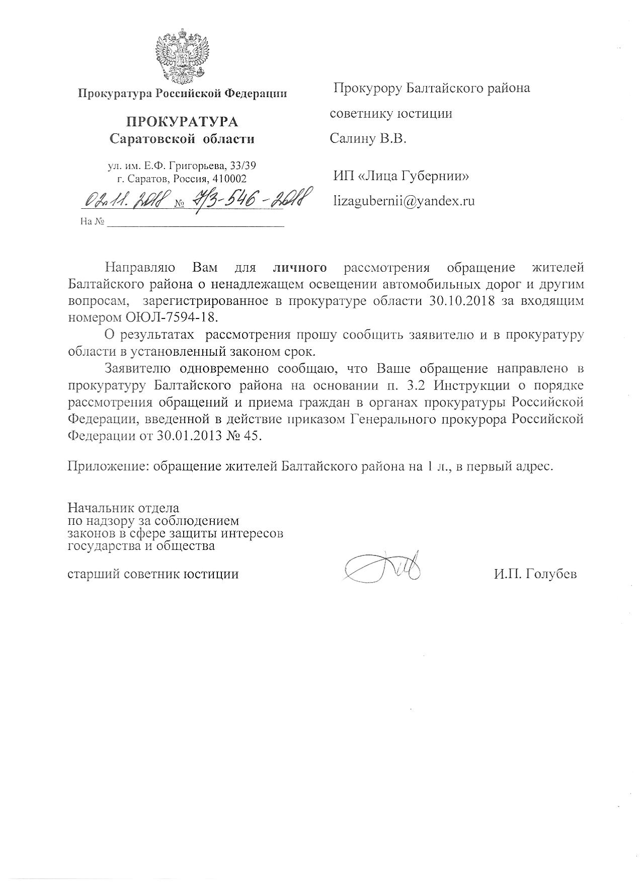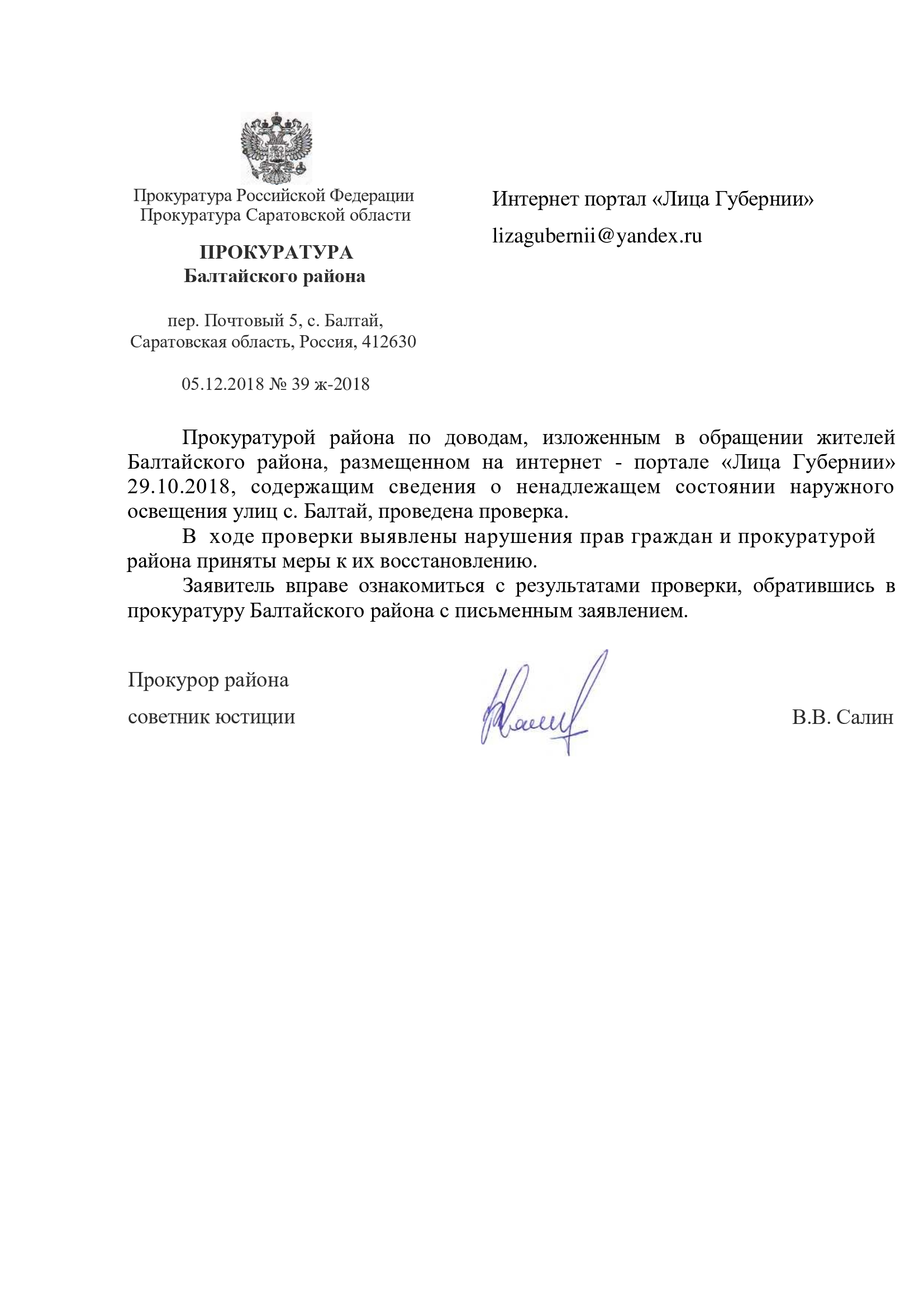 Уважаемый Сергей Владимирович на протяжении двух месяцев в районном центре Балтай практически отсутствует уличное освещение. Хорошо освещена улица Победа ведущая к дому главы района Скворцова СА и улица Ленина ведущая к зданию администрации района, а вот дальше начинается кромешная тьма. В сентябре я обратился в прокуратуру Балтайского района с просьбой повлиять на должностных лиц, но ответ зам прокурора Моисеева К.П. меня сильно удивил. Так как, согласно справки полученной из администрации Балтайского муниципального района, проведена работа по освещению улиц Школьной, Степана Разина, Лесная и пос. Джлавян, а на оставшихся 22 улицах ведутся ремонтные работы(в течении 2х месяцев), то оснований для принятия мер прокурорского реагировании не имеется. Получается осветили 20 процентов поселка радуйтесь и этому. А тем временем жители ежедневно подвергают свою жизнь и здоровье опасности.