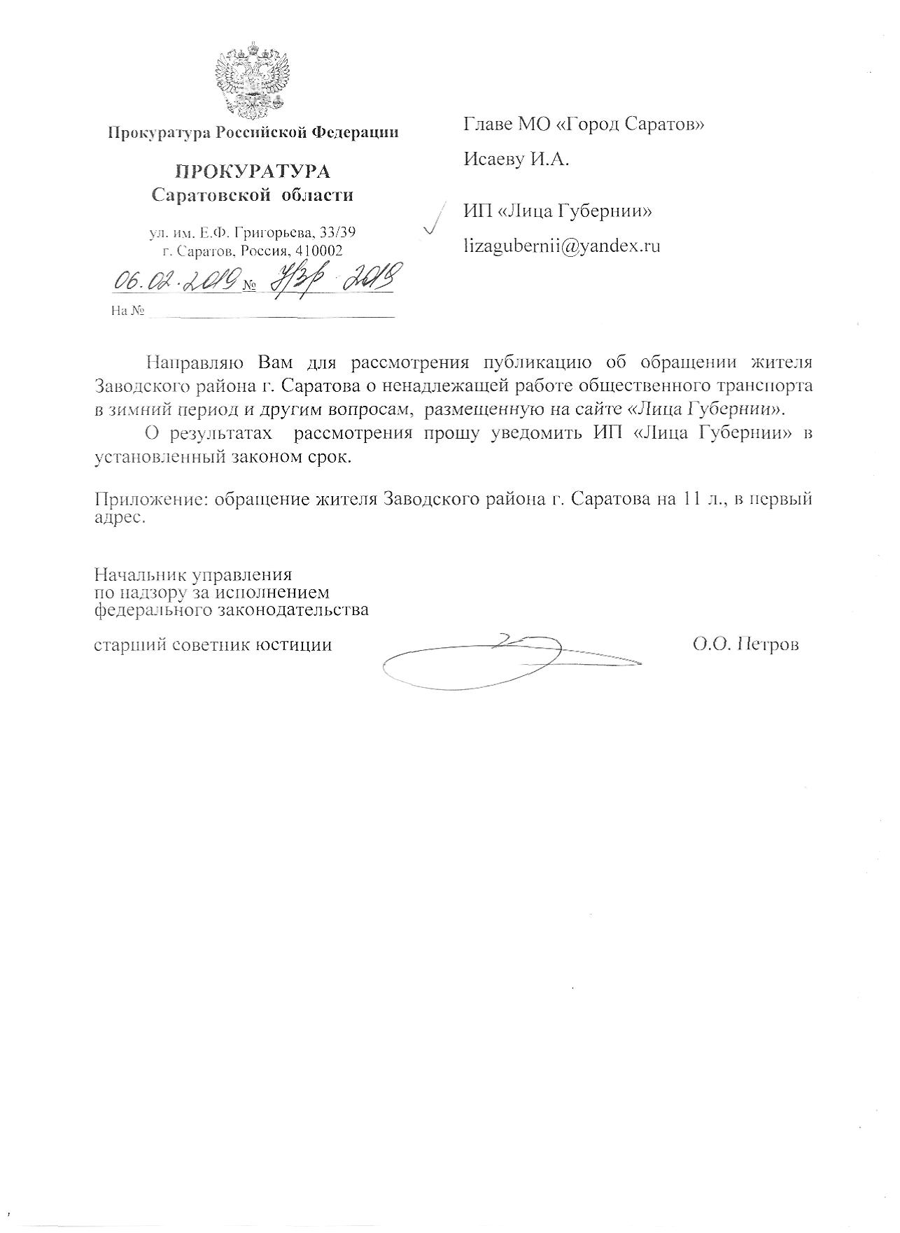 Прошу Вас обратить внимание на бездействие должностных лиц, которые не обеспечили бесперебойную работу общественного транспорта, электротранспорта г. Саратова, довели состав трамвайного парка Заводского района, г. Саратова до износа 90% (трамваи Заводского района не отвечают безопасности перевозки пассажиров), своевременно не проводили расчистку дорог, автомагистралей, трамвайных путей.