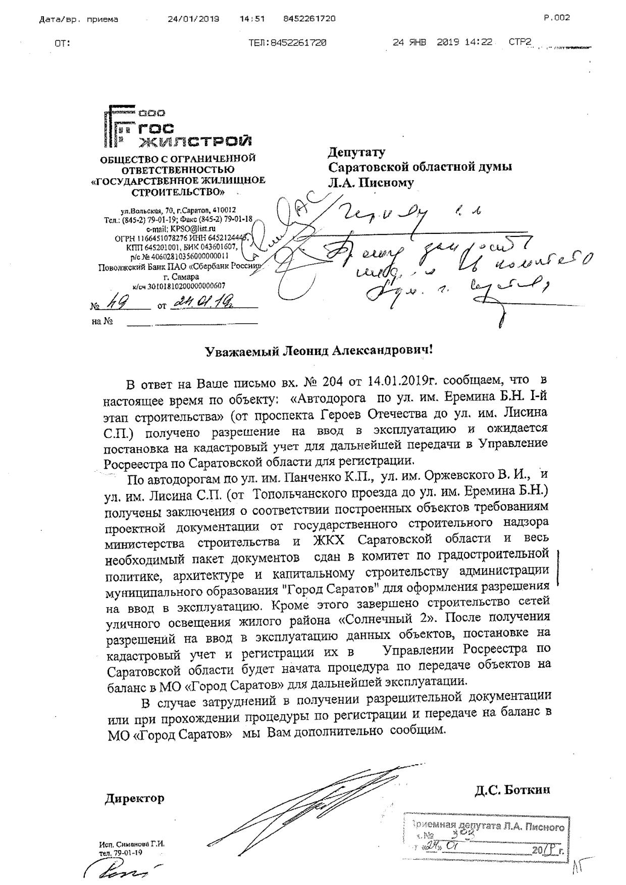 Уважаемая Виктория, как это ни стыдно сказать, дороги до сих пор не переданы городу и большей частью не введены в эксплуатацию. Копии ответов ООО «Госжилстрой» прикрепляю, чтобы вы могли прочитать, что мы постоянно их трясём. Но пока, к сожалению, недотрясли. Поэтому организация очистки микрорайона, там, где удалось, осуществлялась администрацией района, привлекались управляющие компаниеи, несколько раз «Саратооблжилстрой» выделял механизмы, я других коллег просил. Конечно, при таком обильном снегопаде не иметь системной очистки и закрепления специализированных дорожно-строительных организаций — это безобразие. Поэтому, думаю, что летом дожмём. Ибо, поверьте мне телефон депутатской приёмной не замолкал после всех снегов. Парадокс ситуации в том, что в новых микрорайонах, во дворах, чище, чем на широких улицах, которые ведут к этим дворам. А хотелось бы, чтобы чисто было везде. Поэтому дожимаем и думаю, что доведём до конца.