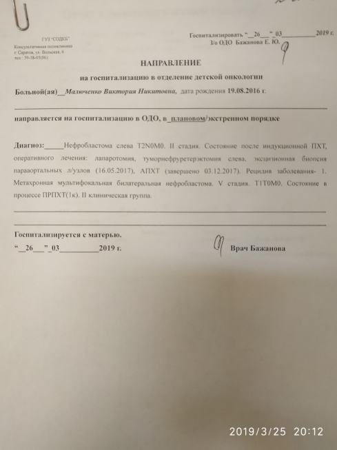 Но вдруг в 2019 году пришла беда.. У младшей дочери обнаружили рак на второй почке/единственной/. В настоящее время мы с февраля месяца этого года лежим в детской онкологии, нам провели курс сильной химии терапии , и готовят на операцию в г. МосквУ. Я не работаю, по причине ситуации в нашей семье, единственным кормильцем является муж. Зная Ваши проявления и любовь к детям, Прошу Вас оказать помощь, для лечения и реабилитации моего ребенка.СПАСИБО!!! С уважением Людмила.