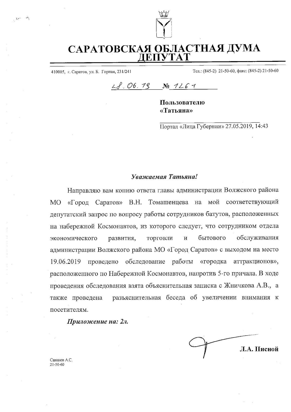 Уважаемый Леонид Александрович! Хочу Вам рассказать какой беспредел творится на батутах. Дело в том, что мы в субботу ( 25.05.19) с ребенком гуляя по Набережной (нашей прекрасной) зашли на батуты, все было хорошо, но как только моя дочка стала прыгать на батуте, её укусила пчела, дочка не пропрыгала и 2 х минут. Я вежливо попросила вернуть деньги, хотя бы половину. На что мне парень ответил: " НЕТ, пусть прыгает, и что он не обязан отпугивать нам ос и пчел.Видимо обязан просто сидеть и смотреть в телефон, а да, еще брать деньги! И, как так прыгает? Ребенок еле ходила... Большая просьба разобратьсяс таким беспределом. Заранее бьлагодарю! С уважением Татьяна