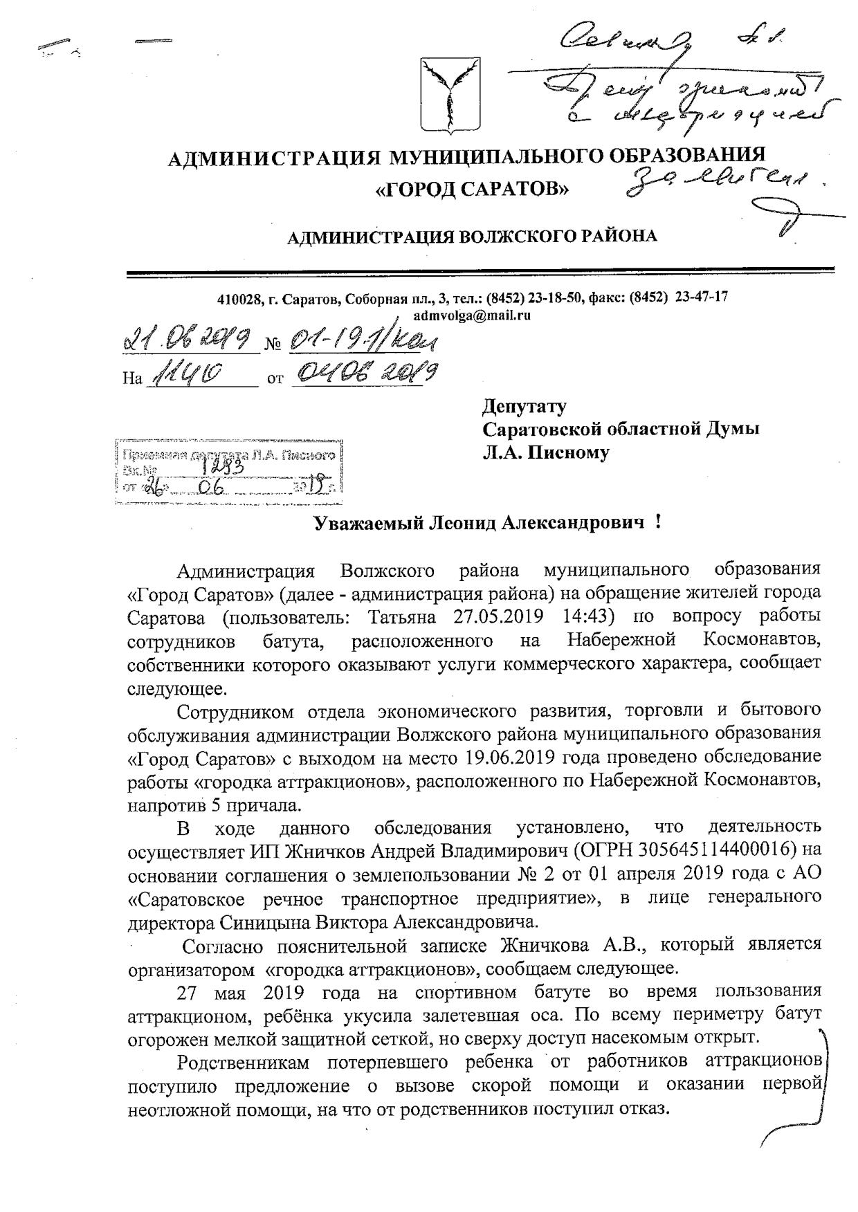 Уважаемая Татьяна, я думаю, что контроль за этим вопросом должна осуществлять администрация соответствующего района, которая дала разрешение на установку батута. Поэтому я сообщу в Волжскую администрацию, чтобы они провели работу с теми, кому они предоставляют свои площади под размещение, чтобы не хамили. И уж тем более в таких ситуациях шли навстречу людям, а не говорили про пчел, которые летают сами по себе.