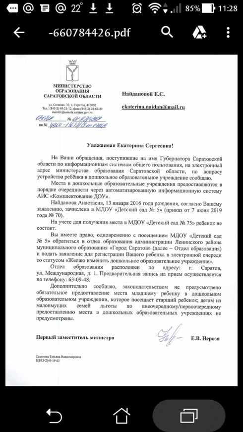 Добрый День Леонид Александрович. Сегодня получила письмо с министерства образования, о том что, помоч мне не смогли с моей проблеммой с детским садом. Файл вложила с содержимым. Скажите это окончательно или все же можно что то предпринять, очень расстроена, ведь надеялась на лучшее. Пожалуйста ответьте как можно скорее, какие мои дальнейшие действия?