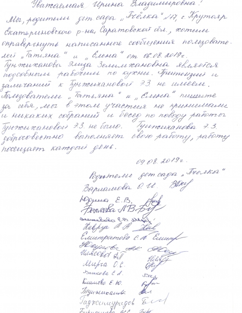 Уважаемая Ирина Владимировна! Мы родители детского сада "Пчелка" с.Крутояр Екатериновского района Саратовской области, хотим оправергнуть написанные сообщения пользователей "Татьяна" и "Елена" от 06.08.2019 года. Тунжиханова Элиза Зелимхановна является пособным рабочим по кухне. Притензий и замечаний к Тунжихановой Э.З. не имеем. Пользователи "Татьяна" и "Елена" пишите за себя, мы в этом участия не принимали и никах собраний и бесед по поводу работы Тунжихановой Э.З. не было. Тунжихановой Э.З. добросовестно выполняет свою работу, работу посещает каждый день. (Письмо написано 09.08.2019 года совместно с родителями дет.сада "Пчелка", свое согласие родители подтвердили личной подписью. Скан письма с подписями прилагаю.)