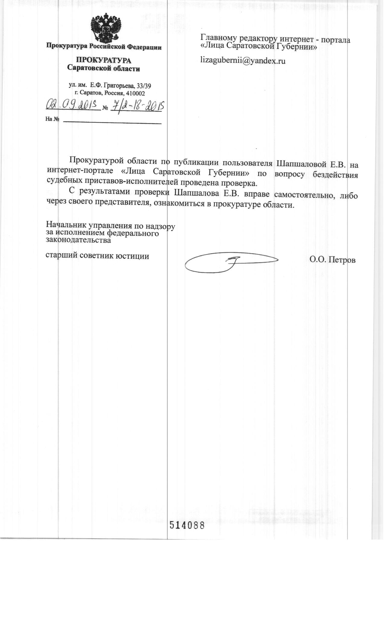 Добрый день! Я являюсь матерью двух несовершеннолетних детей. Мой бывший муж Шапшалов Сергей Петрович не платит алименты и задолженность на сегодня составляет более 500 тыс. рублей. Обращения в Марксовскую прокуратуру и Саратовскую областную прокурату не дали результата. Пристава не науказали, меры прокурорского реагирования не приняты, одни отписки. Письма из Саратовской областной прокуратуры в Марксовскую прокуратуру отправляют почтой. Что у Вас нет системы электронного документооборота? В Марксовской прокуратуре регистрируют документы по три дня, ссылаясь на ФЗ. Три дня документ просто лежал и им никто не занимался.