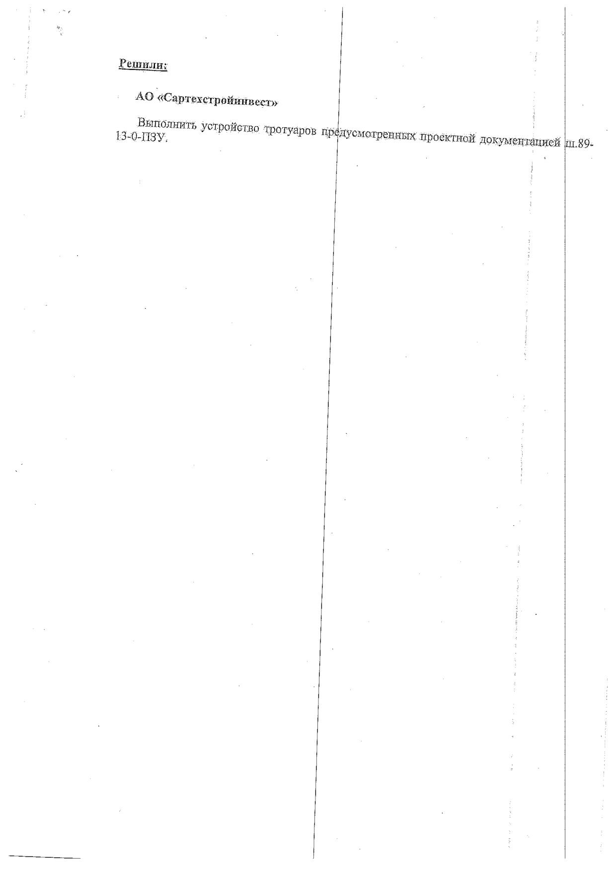 Уважаемая Виктория, по тротуару удалось выяснить. Было два раза совещание: одно на месте, другое в Минстрое, его проводил замминистра Бутылкин. Тротуары проектом были предусмотрены. Поэтому то, что касается той части, где застройку осуществлял «Кронверк», они однозначно сказали, что они будут выполнены. Ситуация с «Сартехстройинвестом» сложнее. Протокол прикладываю, буду дальше заниматься этим вопросом.